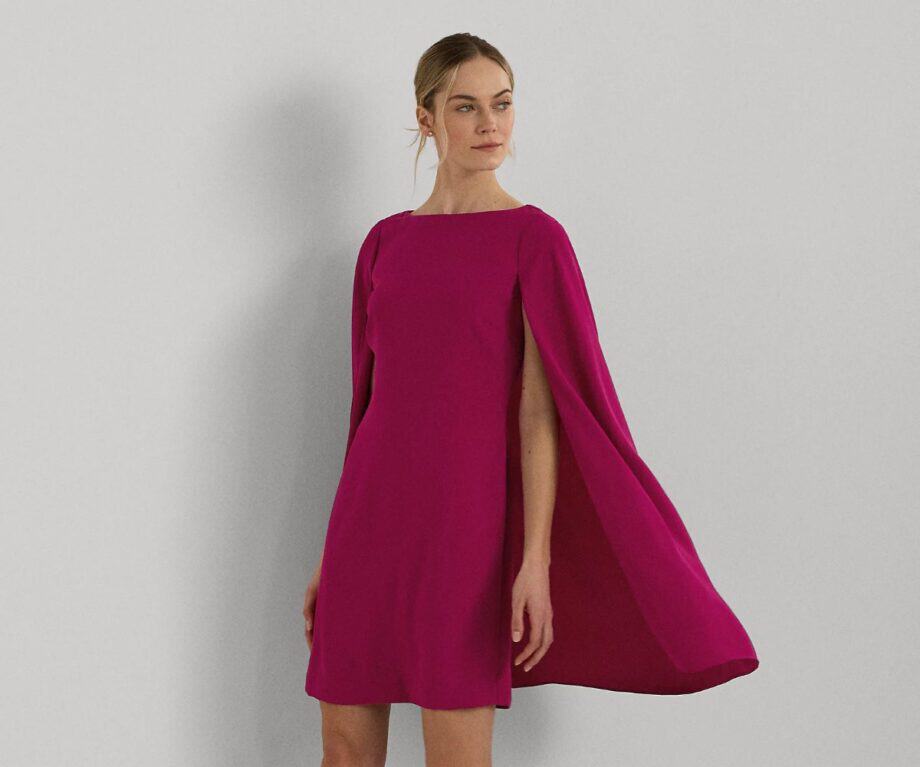 A stylish choice for special occasions, this modern georgette cocktail dress from Ralph Lauren is elevated by a cascading cape, which adds fluid movement to its body-hugging silhouette. Perfect for evening events and formal gatherings, this dress combines elegance with contemporary flair, ensuring you stand out wherever you go. Its rounded neckline and a concealed left-side-seam zip with a hook-and-eye closure, provides a seamless and sophisticated finish for those special evenings out as you travel.