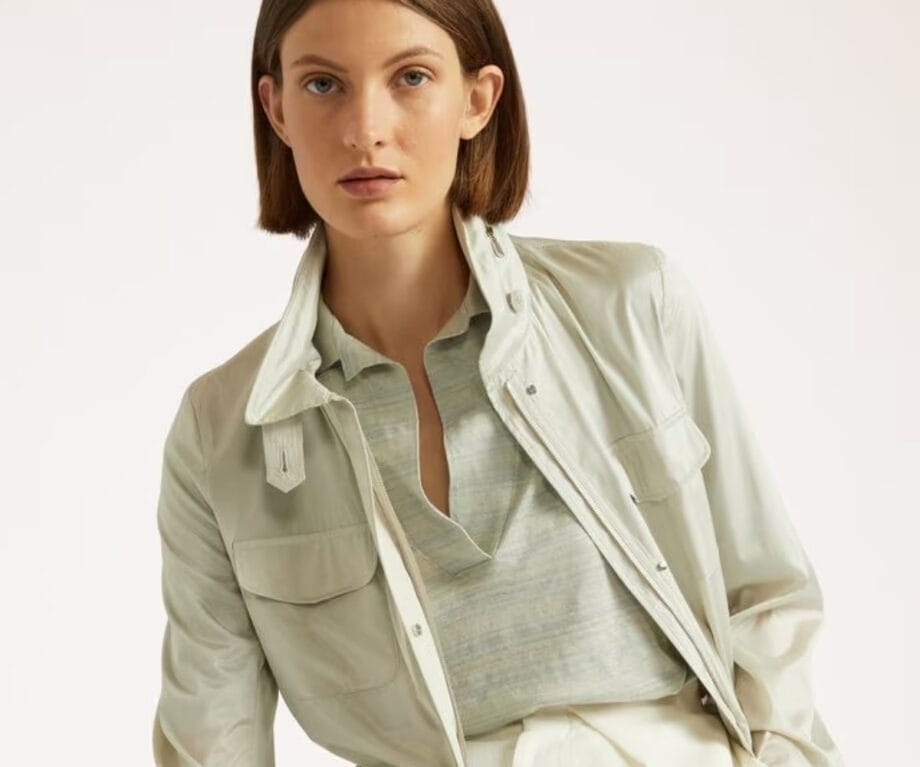 This casual Loro Piana jacket crafted from technical silk fabric has been treated with a water-repellent finish. It is versatile, comfortable outerwear that is perfect for leisure time and travel thanks to the numerous multi-purpose pockets, the hood concealed in the collar, and the waist drawstring.