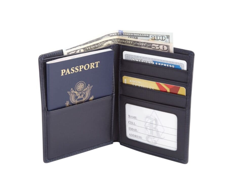 The Royce RFID Blocking Passport Wallet is a stylish and secure travel wallet handcrafted from premium full grain leather. It ensures your passport and personal information stay protected from RFID hackers and comes with dedicated slots for your passport and 3 credit cards. There is also an ID window for easy access and separate compartments for currencies. Designed for both security and convenience, you can even personalize it with free monogramming for a truly special touch.