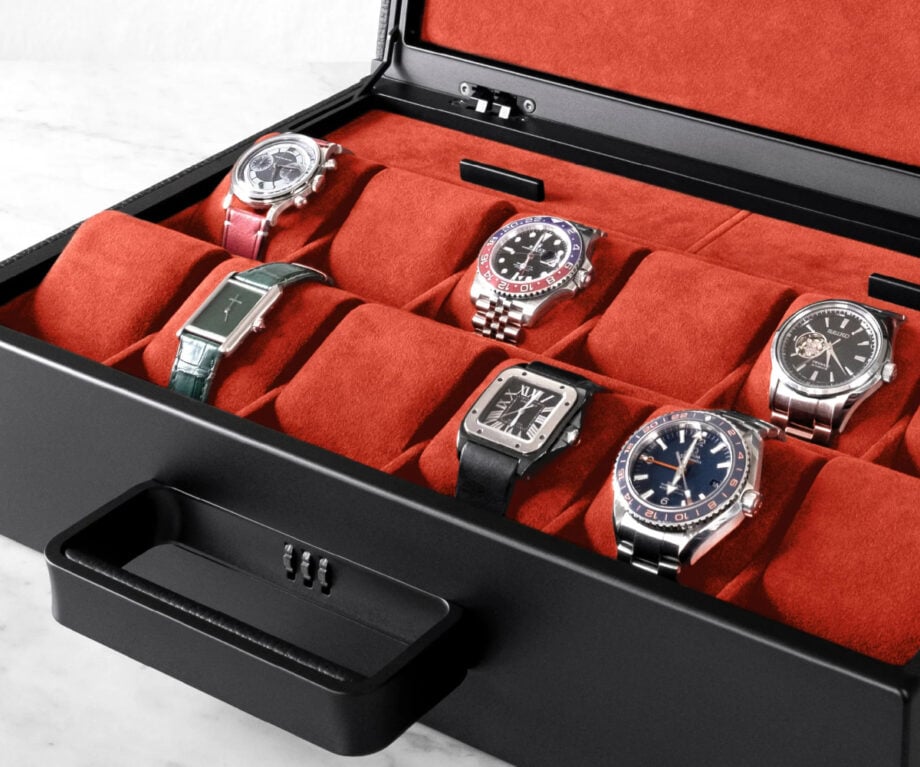 The Mackenzie 12 Watch briefcase from Charles Simon – in all black with vermilion interior – is the refined way of keeping your watch collection. Crafted by hand in Canada, this watch briefcase features a minimalist aesthetic with a vibrant twist and is made from premium materials.