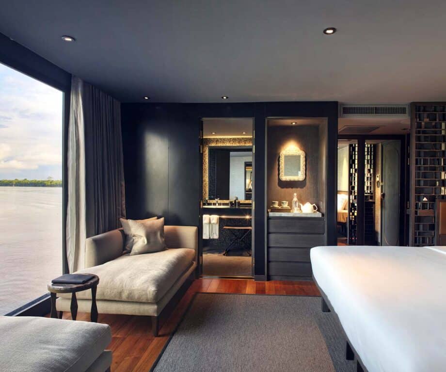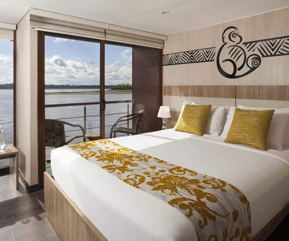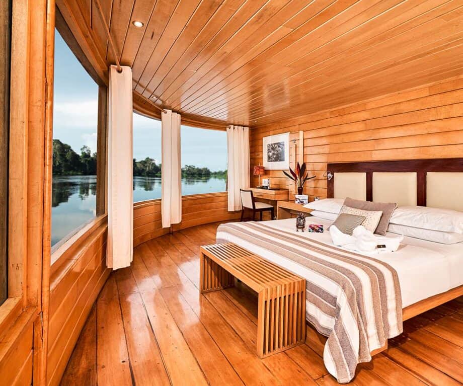 While on board, relax in a luxurious suite or enjoy social spaces such as the spa, plunge pool, jacuzzi, gym, or movie room. The vessels take guests up the river accompanied by the culinary genius of celebrated chef Pedro Miguel Schiaffino. The suites feature premium fittings and bedding, as well as central air-conditioning and floor-to-ceiling panoramic windows to admire the endless beauty of the Amazon river and rainforest.