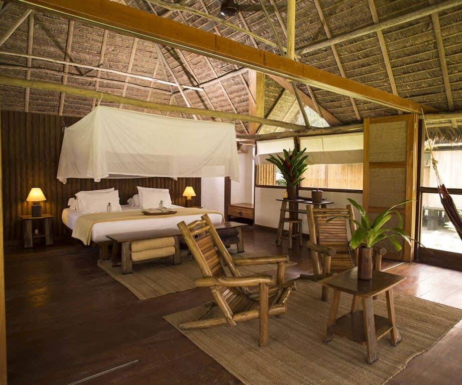 The accommodation comprises high thatched roof wooden cabañas in the style of the local Ese’Eja community. The décor echoes the simple style of Amazonian houses but with luxurious touches such as 100% cotton sheets and Amazon rubber slippers. Each room has a screened siesta area complete with hammock for full jungle relaxation.
