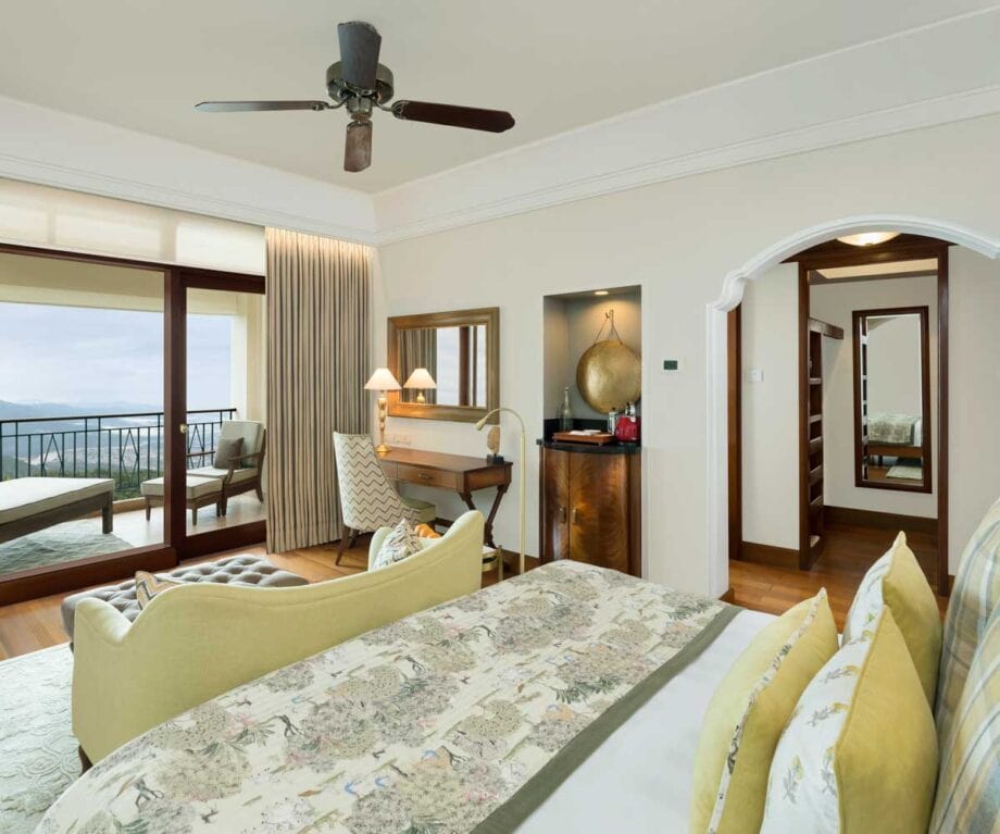 Arriving at Ananda in the Himalayas is unforgettable. The drive itself is a steady climb that winds its way up from the valley below, bringing you almost a thousand metres above sea level, and just when you wonder what could possibly be waiting at the top, the gates of the Viceregal Palace come into view. The palace estate, once the residence of the Maharaja of Tehri Garhwal has been carefully restored and adapted for guests, yet still carries an aura of history and elegance. Manicured lawns slope gently towards forest edges where monkeys play in the trees, and beyond those trees, the view stretches all the way to Rishikesh and the sacred Ganges River.