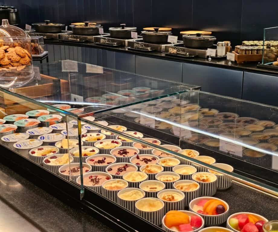 Meanwhile, the central food island anchors the breakfast offering. On it: Greek yoghurts, chopped fruits, cereals, and cakes arranged with a kind of casual elegance.