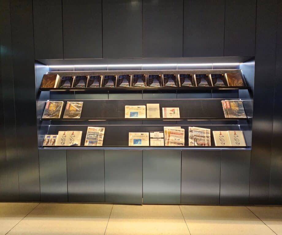 Beyond food and furniture, AEGEAN has thought carefully about function. Charging points are plentiful — built into tables and seating areas alike — and the WiFi fast. A dedicated news stand offers not only AEGEAN’s Blue in-flight magazine but also Athens Voice, Costa Navarino Stores, and a curated selection of Greek newspapers.