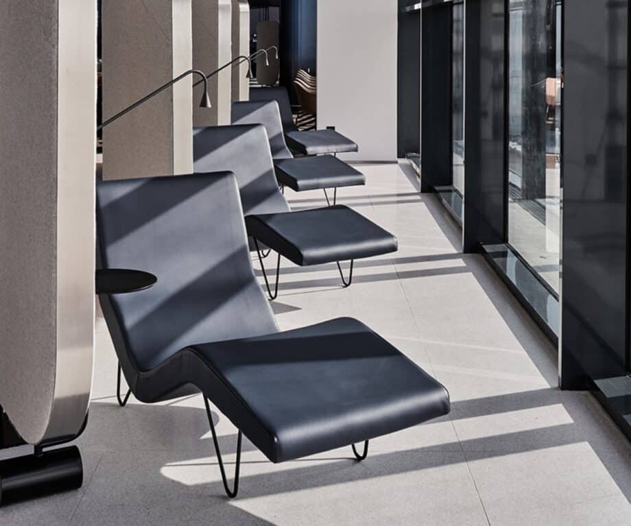 The seating is quietly masterful in its versatility. If you trace the lounge from left to right, you begin with a series of reclining loungers, perfect for power naps or post-red-eye horizontal thinking.
