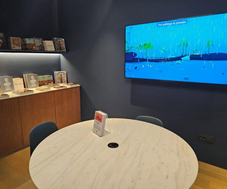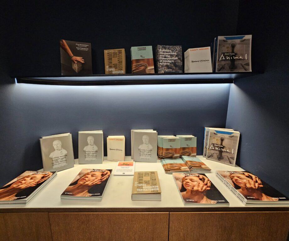Glass walls conceal meeting-room styled spaces, perfect for an hour’s writing or a Zoom call. One room is dedicated to the Onassis Foundation, the entrance intriguingly etched with the words“The Art of Waiting.”