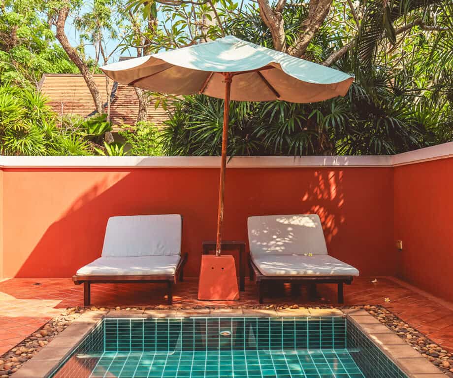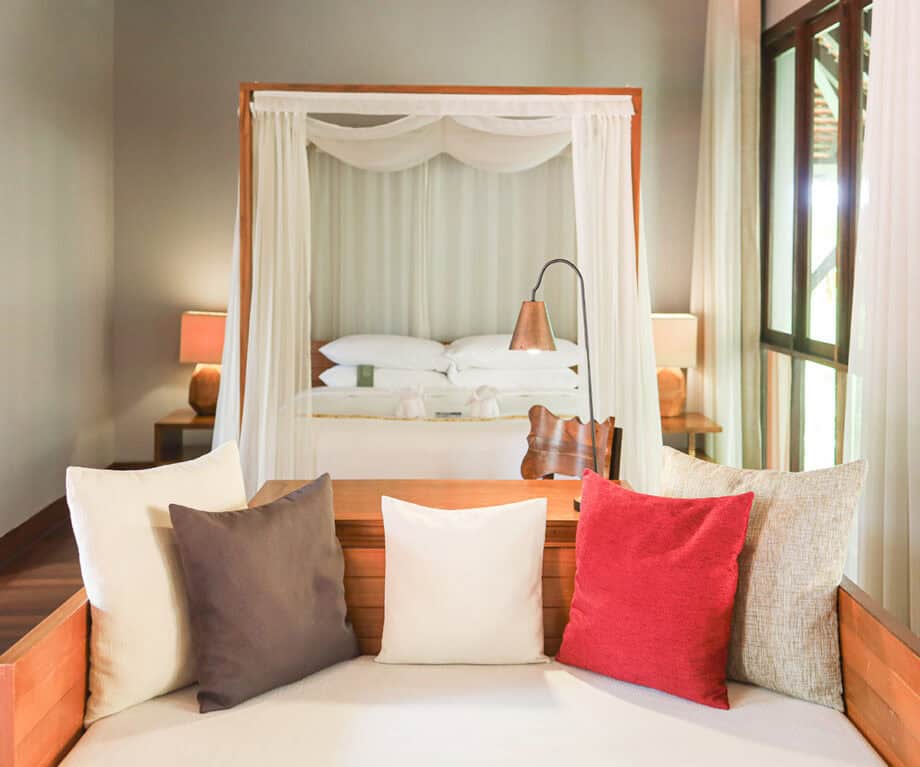 Through a sheath of white curtains at the end of the bathroom, the pool appears – a well-sized and welcome cooldown from the clinging tropical humidity. The pool’s clever design offers a lying section on one side and a deeper area on the other, complemented by loungers.