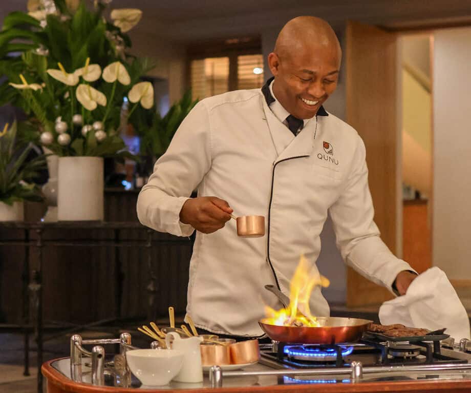 Perhaps the most impressive of these spaces is the restaurant Qunu, named after Mandela’s place of birth and retirement. The multi-volume space has a cathedral-like feel, with exceptional art pieces adorning the walls, tables selectively placed throughout, and a dedicated space for the glossy grand piano, played daily by the talented Jonathan. Unmissable on the menu is the Steak Diane, with its impressive tableside cooking and flame theatrics.