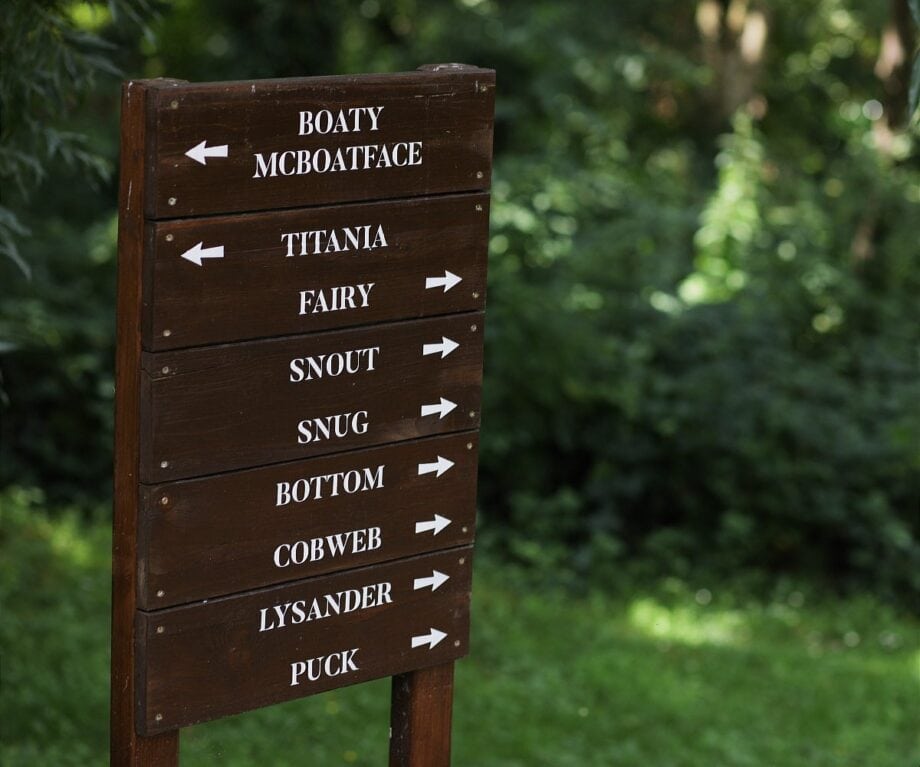 A signpost to Titania, Fairy, Bottom, Snout et al signals that these Hideaway Huts recall Shakespeare’s enchanted forest in A Midsummer Night’s Dream. Fairy lights frame the archway entrance to Snug.