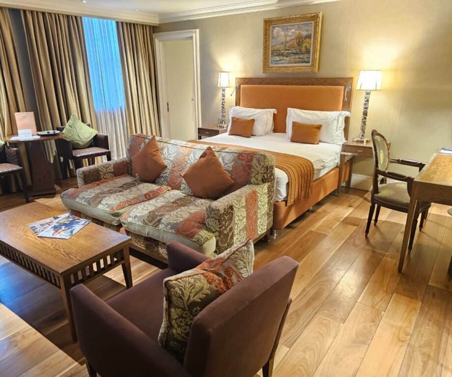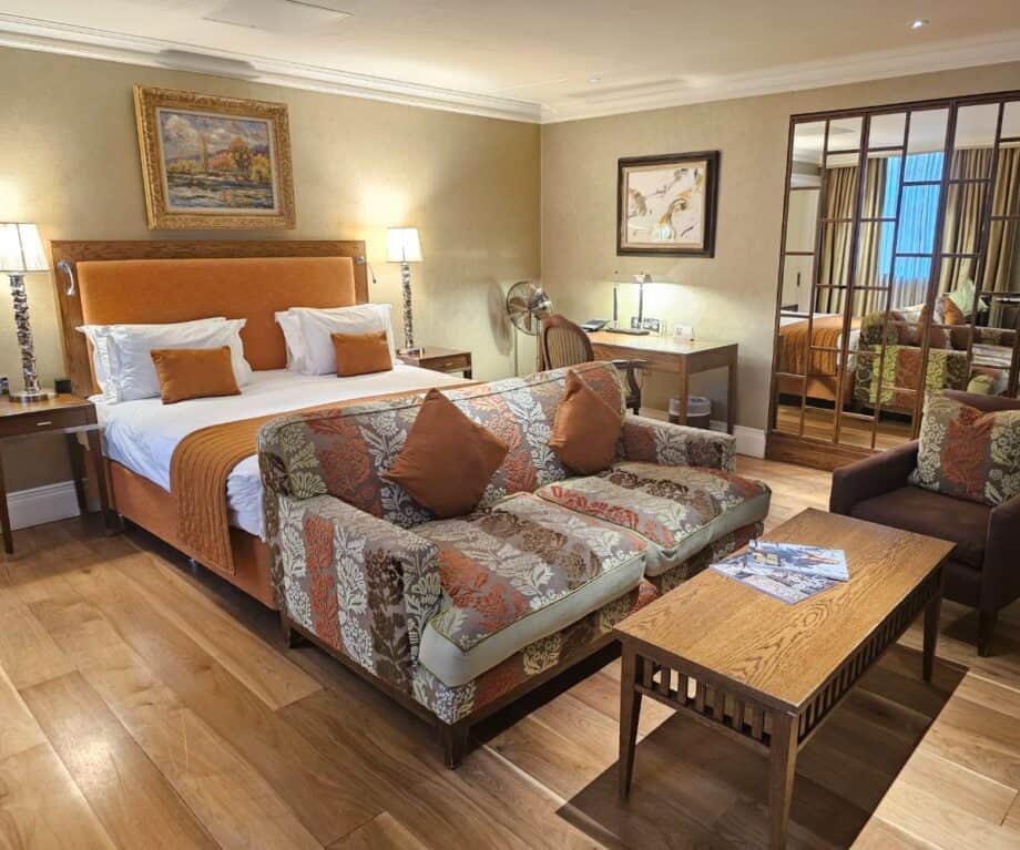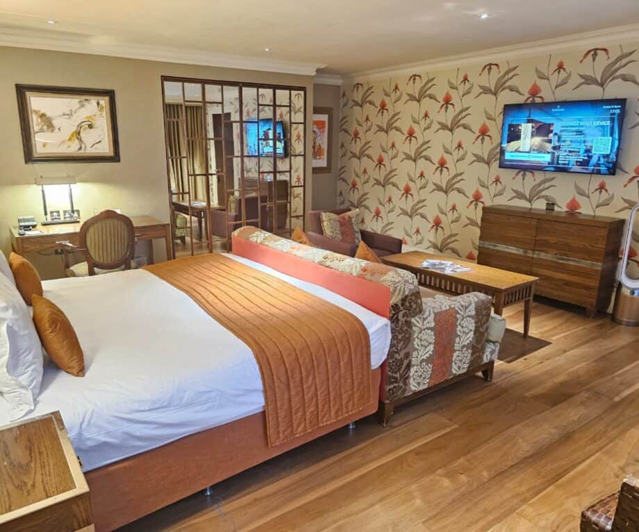 The suite also featured a separate, dual-purpose dressing table/workspace, and fitted wardrobes that concealed thoughtful amenities such as a safe, hairdryer, ironing board and iron, a mini fridge stocked with water and milk, a kettle, coffee maker, and more.