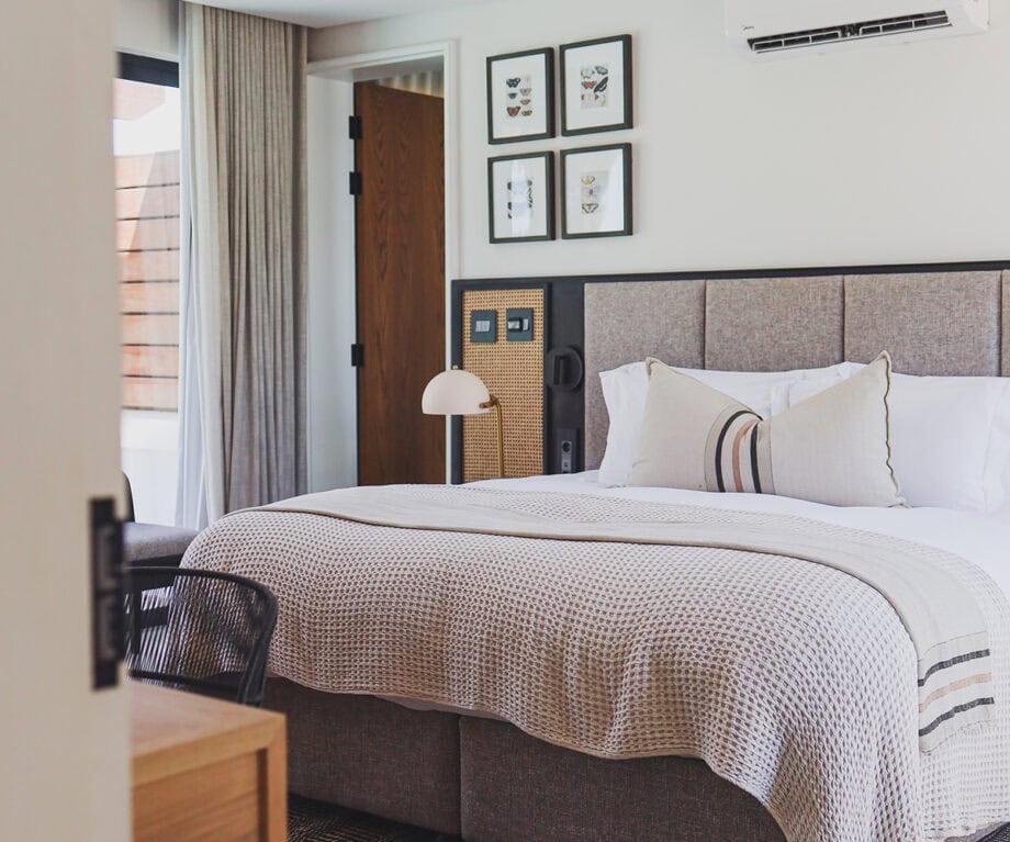 From the central lounge, two identical bedrooms extend outwards, both with invitingly comfortable king beds – adorned with plenty of pillows for those who enjoy creating a sleeping nest – and leading through sliding doors to the outside veranda.
