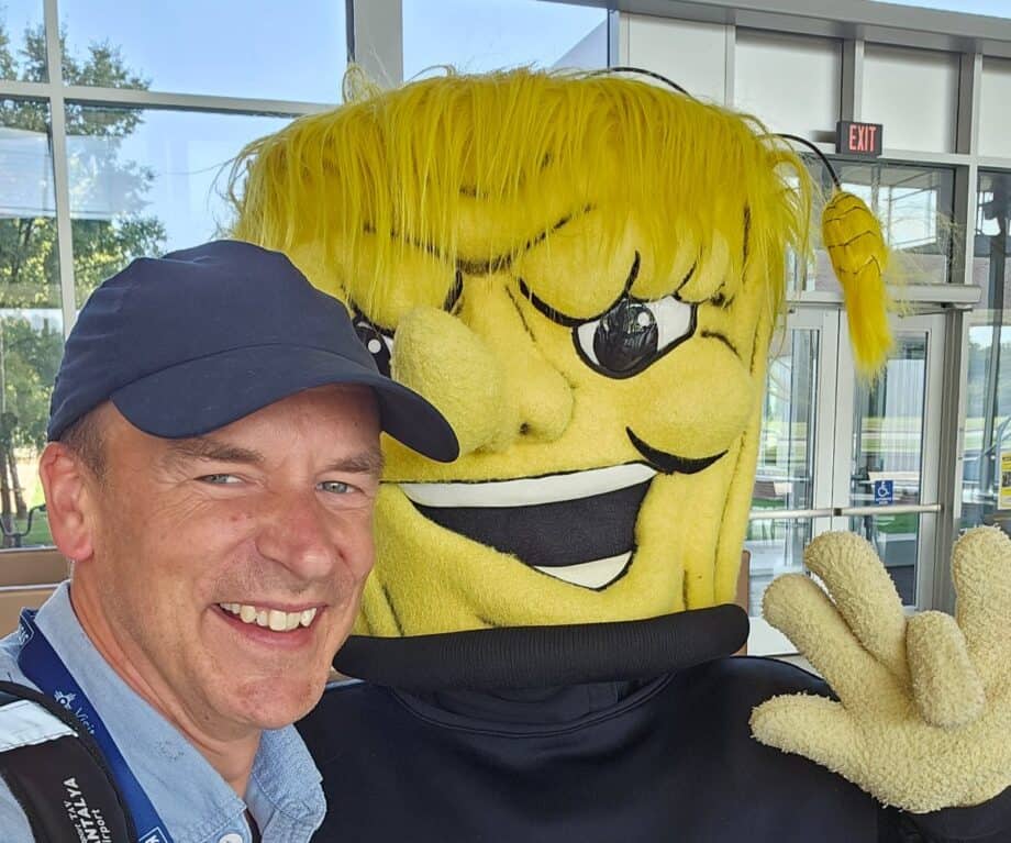 A memorable, delightful and slightly surreal moment was being greeted by WuShock—the university’s amusing mascot, a “muscle-bound bundle of wheat” that, in Wichita vernacular, symbolises the region’s agrarian roots and no-nonsense grit.